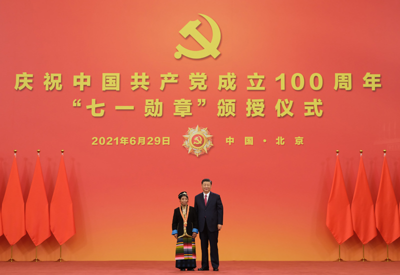 6月29日,慶祝中國共產(chǎn)黨成立100周年“七一勛章”頒授儀式在北京人民大會堂金色大廳隆重舉行。中共中央總書記、國家主席、中央軍委主席習近平向“七一勛章”獲得者王蘭花頒授勛章。新華社記者 李學仁 攝