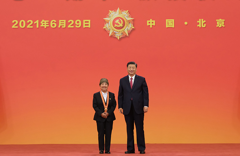 6月29日,慶祝中國共產(chǎn)黨成立100周年“七一勛章”頒授儀式在北京人民大會堂金色大廳隆重舉行。中共中央總書記、國家主席、中央軍委主席習近平向“七一勛章”獲得者卓嘎頒授勛章。新華社記者 李學仁 攝