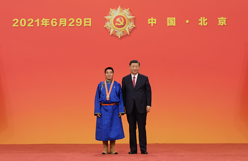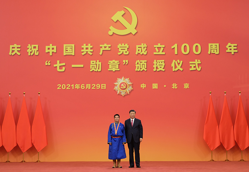 6月29日,慶祝中國共產(chǎn)黨成立100周年“七一勛章”頒授儀式在北京人民大會堂金色大廳隆重舉行。中共中央總書記、國家主席、中央軍委主席習近平向“七一勛章”獲得者廷·巴特爾頒授勛章。新華社記者 李學仁 攝