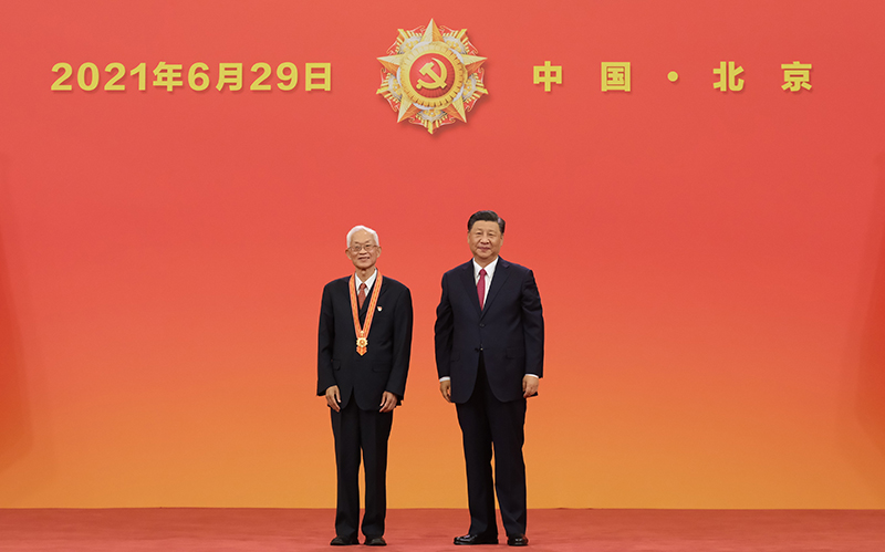 6月29日,慶祝中國共產(chǎn)黨成立100周年“七一勛章”頒授儀式在北京人民大會堂金色大廳隆重舉行。中共中央總書記、國家主席、中央軍委主席習近平向“七一勛章”獲得者周永開頒授勛章。新華社記者 李學仁 攝