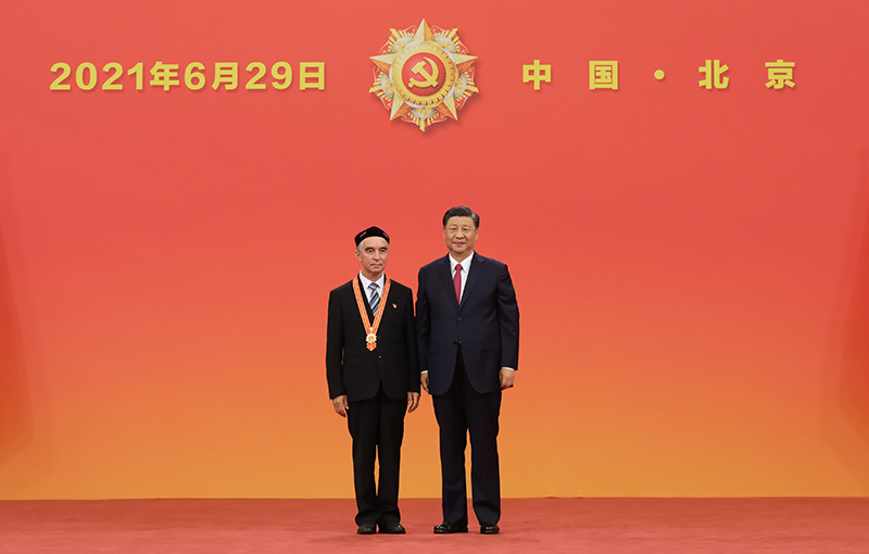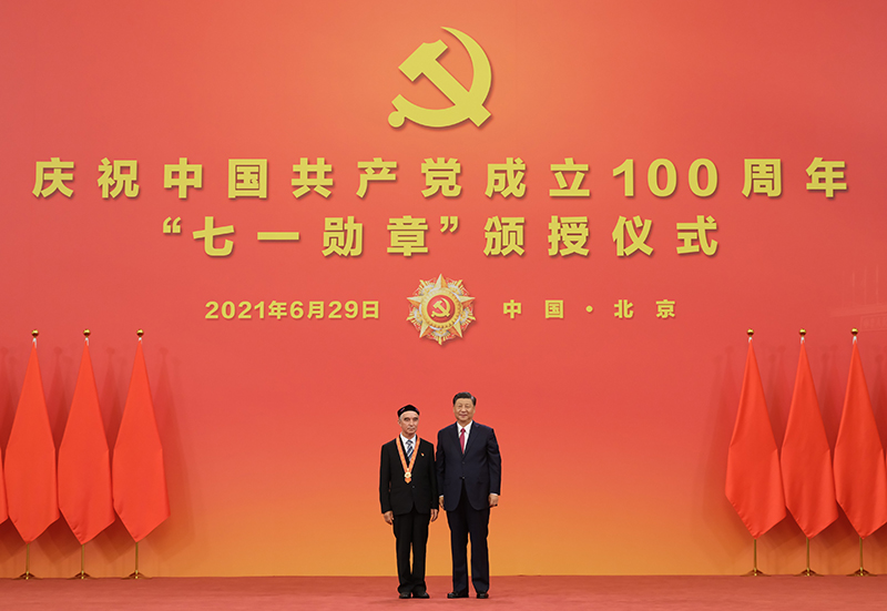 6月29日,慶祝中國共產(chǎn)黨成立100周年“七一勛章”頒授儀式在北京人民大會堂金色大廳隆重舉行。中共中央總書記、國家主席、中央軍委主席習近平向“七一勛章”獲得者買買提江·吾買爾頒授勛章。新華社記者 李學仁 攝