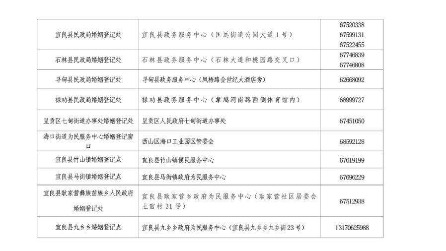 昆明市婚姻登記機(jī)構(gòu)一覽表(2021年)