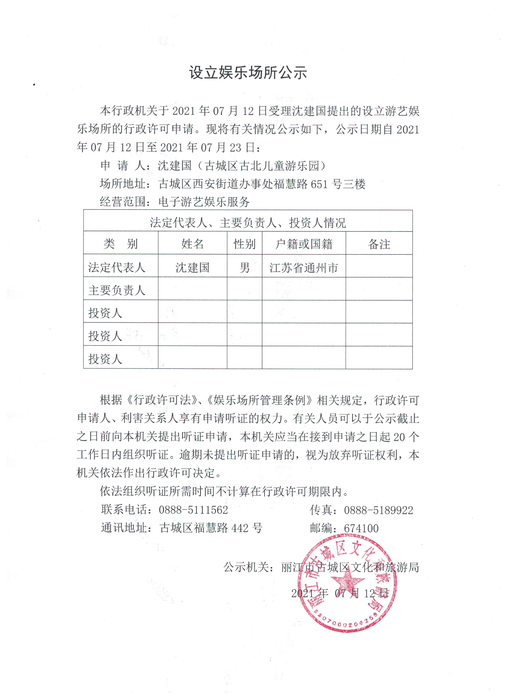 麗江市古城區(qū)文化和旅游局關(guān)于沈建國申請設(shè)立游藝娛樂場所的公示