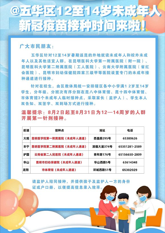 昆明五華區(qū)未成年新冠疫苗接種指南(12-14歲)