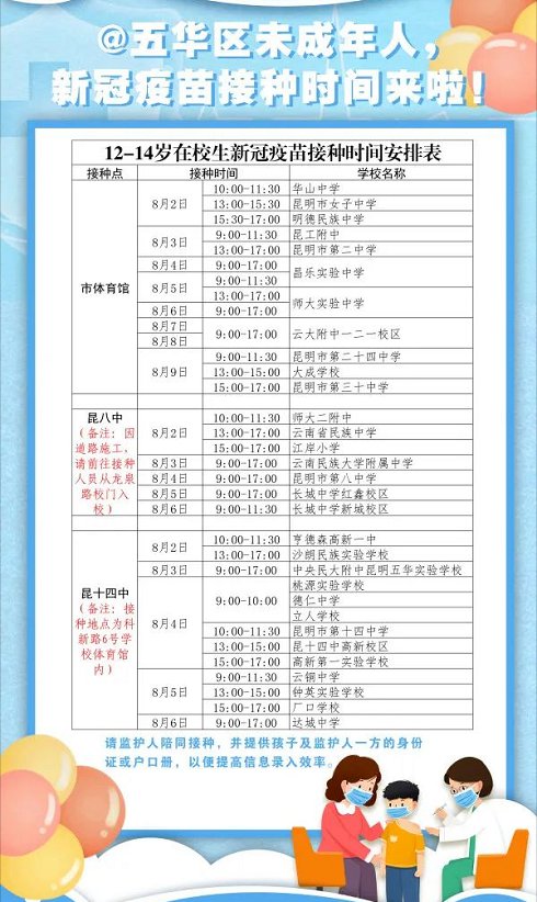 為更好的保護(hù)孩子,確保校園疫情防控安全,五華區(qū)應(yīng)對(duì)疫情指揮部在7月中旬圓滿完成對(duì)轄區(qū)內(nèi)15-17歲未成年接種的基礎(chǔ)上,結(jié)合全區(qū)疫情防控實(shí)際,計(jì)劃從8月2日起開(kāi)始對(duì)轄區(qū)內(nèi)12歲—14歲未成年人接種新冠疫苗,同時(shí)對(duì)上一階段未接種的15—17歲未成年人進(jìn)行補(bǔ)種。