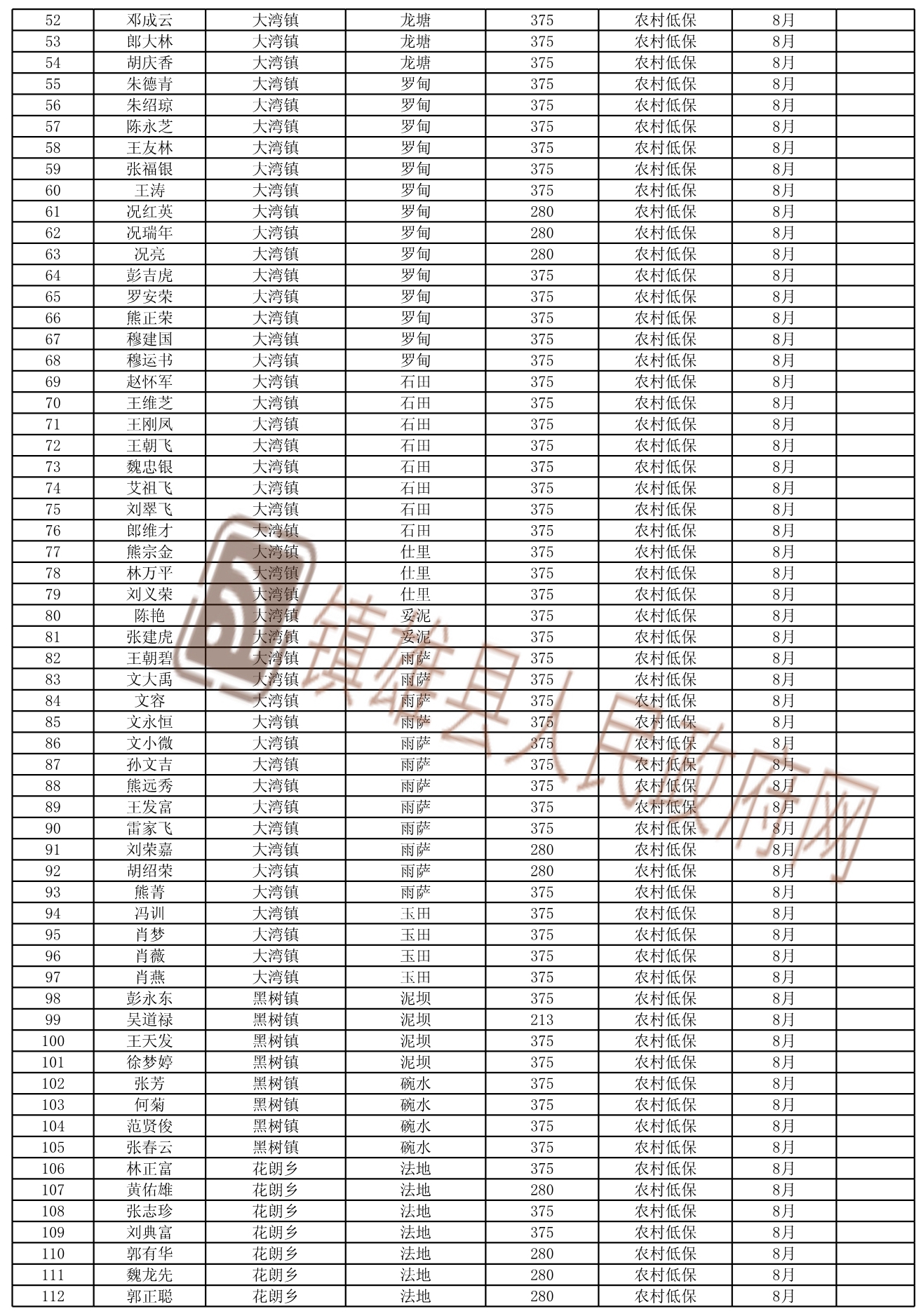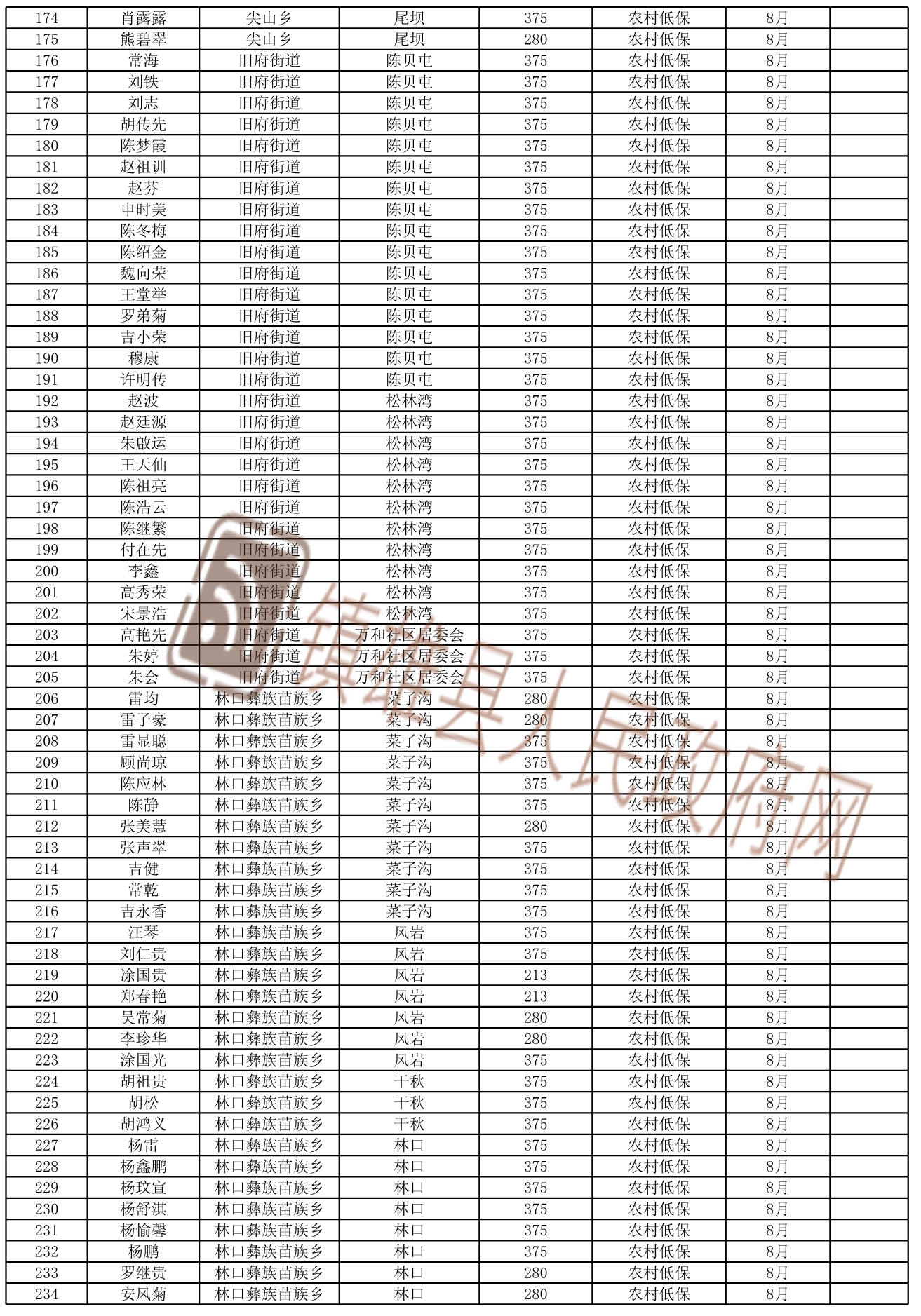 根據(jù)《鎮(zhèn)雄縣陽光低保專項(xiàng)行動實(shí)施方案》,我縣城鄉(xiāng)低保及特困人員救助金發(fā)放按動態(tài)管理后的名單執(zhí)行,F(xiàn)將2021年8月新增城鄉(xiāng)低保的名單及特困人員名單予以長期公示,今后根據(jù)動態(tài)情況適時更新。公示期間,如對城鄉(xiāng)低保人員及特困人員有異議的,請向有關(guān)單位舉報。