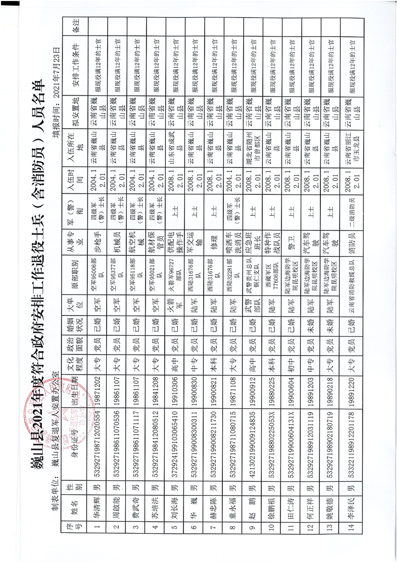 大理州巍山彝族回族自治縣復(fù)員退伍軍人安置辦公室關(guān)于巍山縣2021年度符合政府安排工作退役士兵名