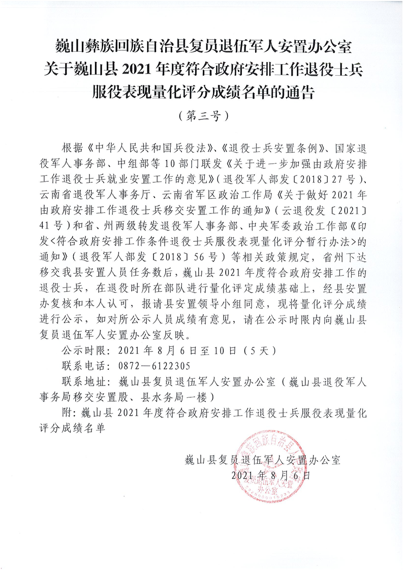 大理州巍山彝族回族自治縣復(fù)員退伍軍人安置辦公室關(guān)于巍山縣2021年士兵服役表現(xiàn)量化評分成績名單
