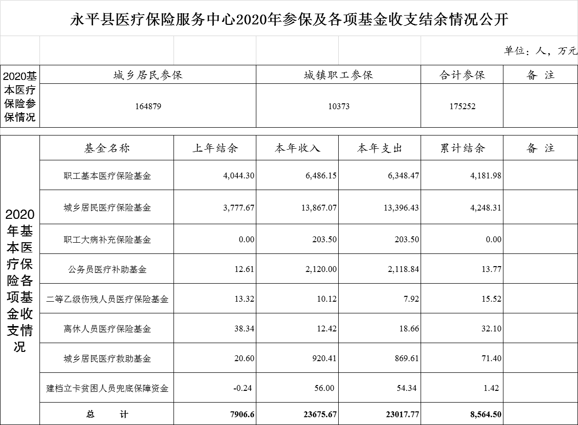 大理市永平縣醫(yī)療保險(xiǎn)服務(wù)中心2020年參保及各項(xiàng)基金收支結(jié)余情況公開