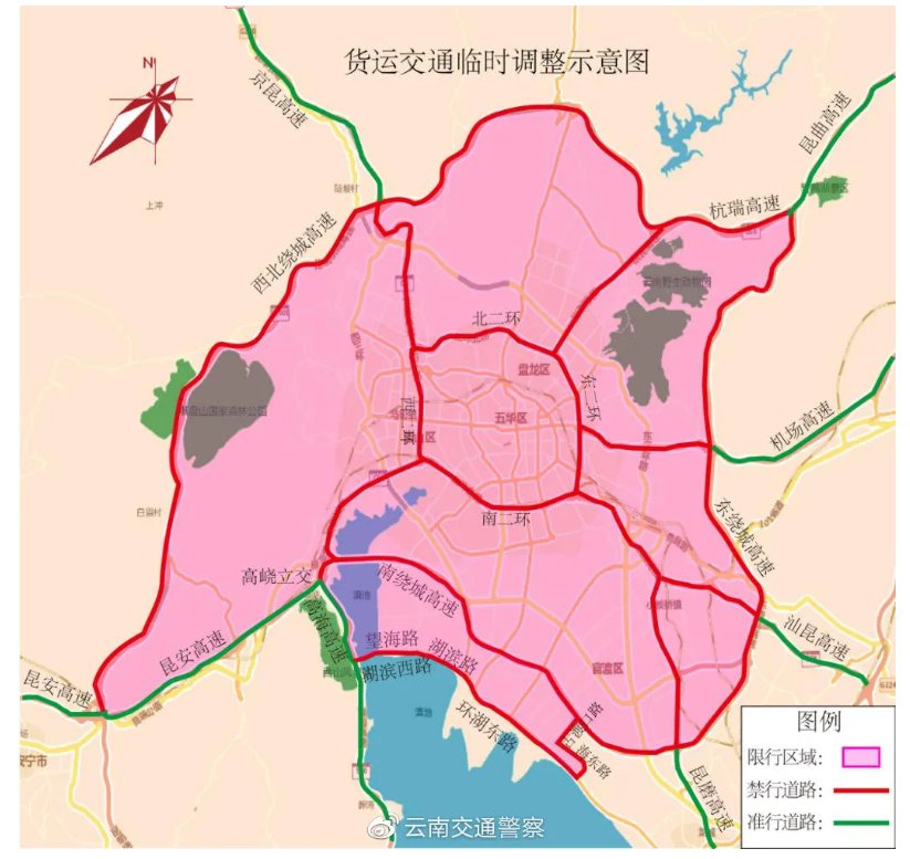 劇毒化學(xué)品運(yùn)輸車輛、核定載質(zhì)量1000千克(含)以上載貨汽車以及牽引車、掛車、吊車等專項(xiàng)作業(yè)車(不含執(zhí)行緊急任務(wù)的特種車輛)全天禁止在東繞城高速(含)-昆曲高速(含)-西北繞城高速(含)-昆安高速(不含)-高海高速(不含)-湖濱西路(含)-望海路(含)-湖濱西路(含)-湖濱東路(含)-環(huán)湖東路(含)-古渡口路(含)-南繞城高速(含)圍合區(qū)域內(nèi)道路通行。