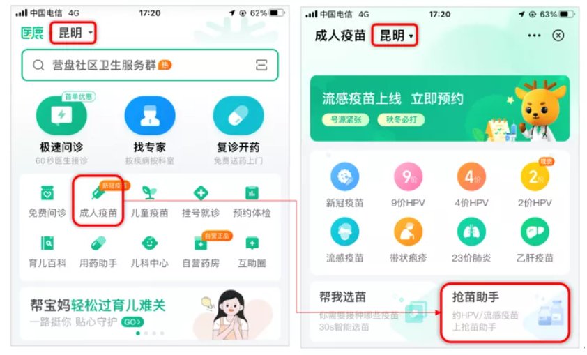 第一步:進(jìn)入官網(wǎng)后,選擇“昆明”地區(qū),點(diǎn)擊首頁(yè)“成人疫苗”,進(jìn)入頁(yè)面后再點(diǎn)擊“搶苗助手”;