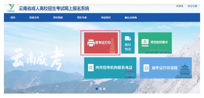 2021年10月20日9:00起,考生可登錄云南省招生考試院網(wǎng)站打印準(zhǔn)考證。具體操作流程如下:
