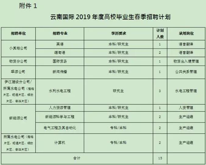 招聘專業(yè)見云南國際2019年度高校畢業(yè)生春季招聘計劃(附件1)。