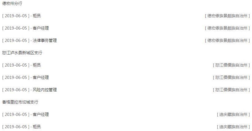 其中,怒江瀘水縣新城區(qū)支行、迪慶香格里拉縣壇城支行招聘學(xué)歷條件為具有國家統(tǒng)招的普通高等院校大學(xué)專科(含)以上學(xué)歷。