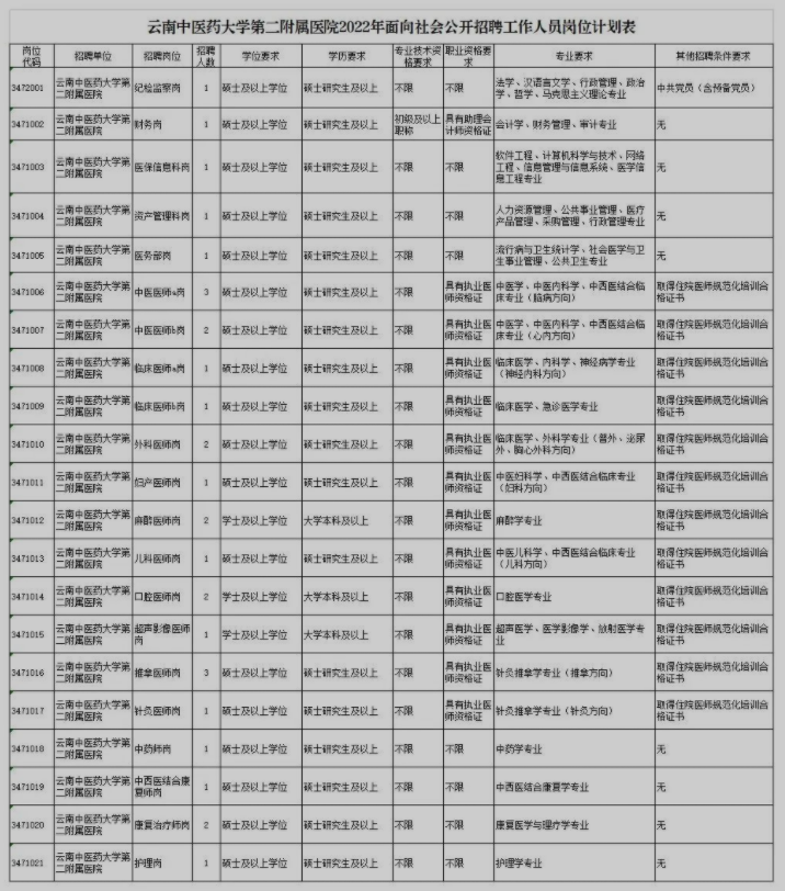 具體招聘要求可查看《云南省衛(wèi)生健康所屬事業(yè)單位2022年面向社會公開招聘工作人員的公告》