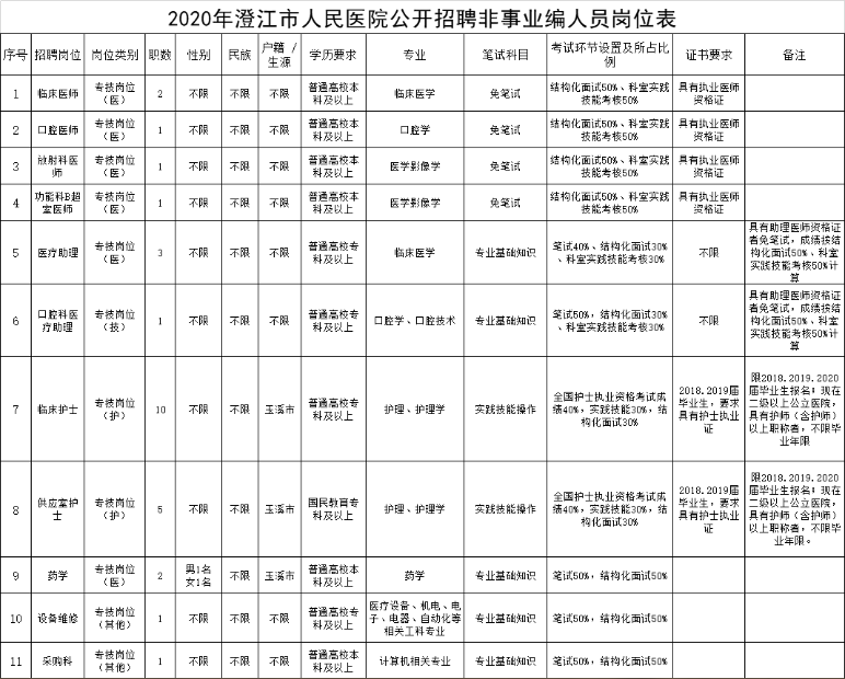 澄江市人民醫(yī)院2020年度面向社會(huì)公開(kāi)招聘非事業(yè)編制工作人員38名,F(xiàn)將第一批招聘28名工作人員有關(guān)事宜公布如下: